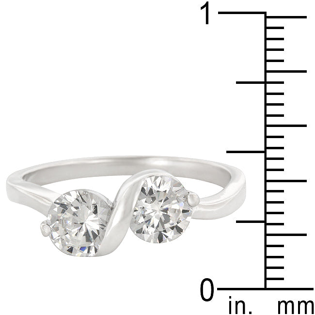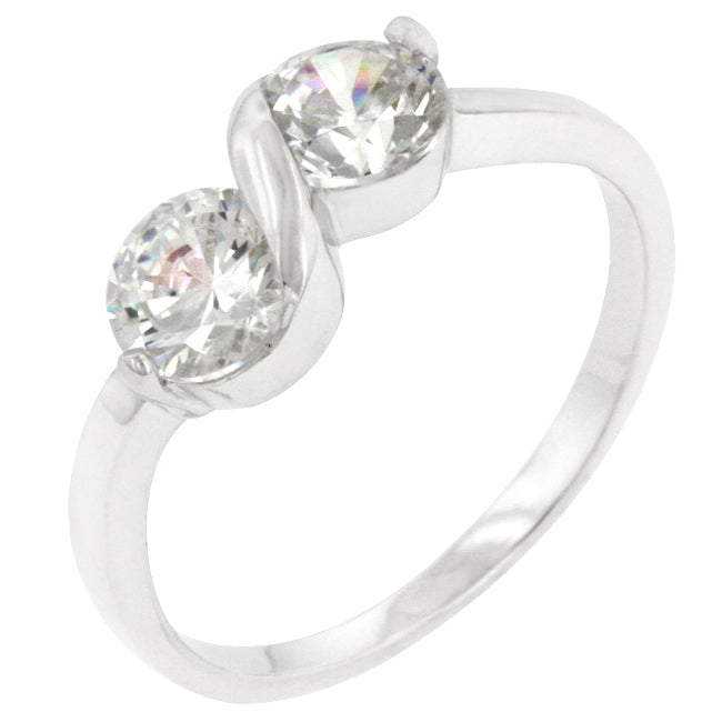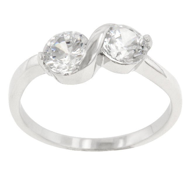 This anniversary style features two round cut clear cubic zirconia set on a silver tone band. Genuine Rhodium Plating is achieved using an electroplating process that coats the item with heavy layers of rhodium a close cousin to platinum which gives our jewelry a platinum luster.